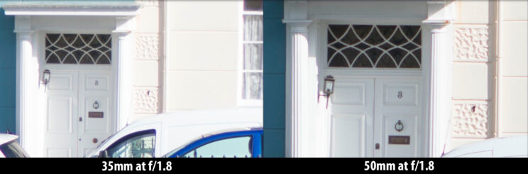 In this case, we can see that the 50mm displays better sharpness, detail and micro contrast at the centre when set to their shared maximum aperture of f/1.8. This can partly be attributed to the increased magnification of the 50mm.