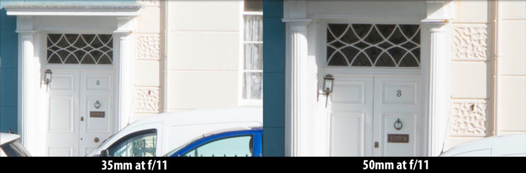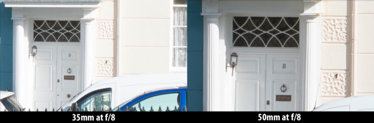 The 50mm produces very little native distortion and that which does exist is either corrected in-camera (JPGs) or in a post-production software such as Lightroom with the native lens profile (RAW). In fact, if you disable the profile corrections in Lightroom, there is hardly any difference between the corrected and uncorrected versions. Do the same with images taken with the 35mm and you’ll notice a small adjustment to the extreme corners.