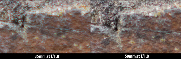 At this distance, both lenses are somewhat soft at their fastest aperture of f/1.8 but sharpness visibly improves by f/2.8. Between the two, the 50mm appears ever-so-slightly sharper than the 35mm at both values.