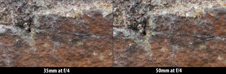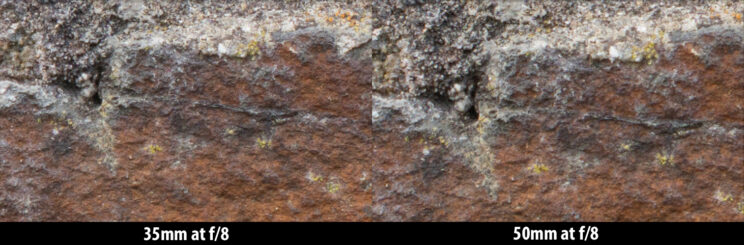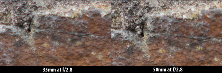Stop down to f/2.8 and we see a noticeable jump in sharpness and contrast from the 35mm. The 50mm also shows an improvement but it isn’t as perceptible as with the 35mm. Between the two, the 50mm remains slightly sharper.