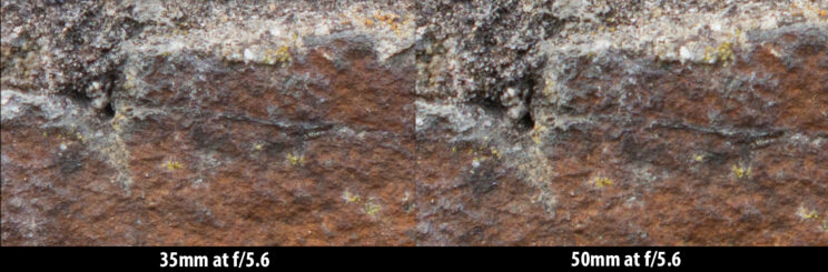 At f/4 and f/5.6, the 35mm continues to improve while the results from the 50mm remain more or less the same as f/2.8. At these values, the lenses reach their peak performance and are quite comparable if we exclude the difference in magnification.