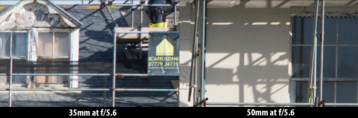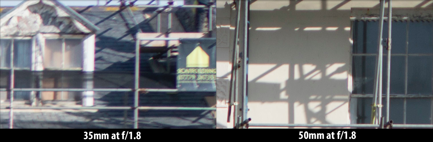 In this case, we can see that the 50mm displays better sharpness, detail and micro contrast at the centre when set to their shared maximum aperture of f/1.8. This can partly be attributed to the increased magnification of the 50mm.