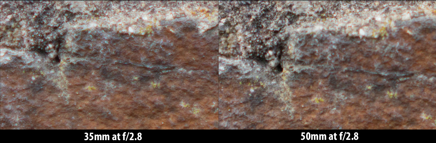 At this distance, both lenses are somewhat soft at their fastest aperture of f/1.8 but sharpness visibly improves by f/2.8. Between the two, the 50mm appears ever-so-slightly sharper than the 35mm at both values.