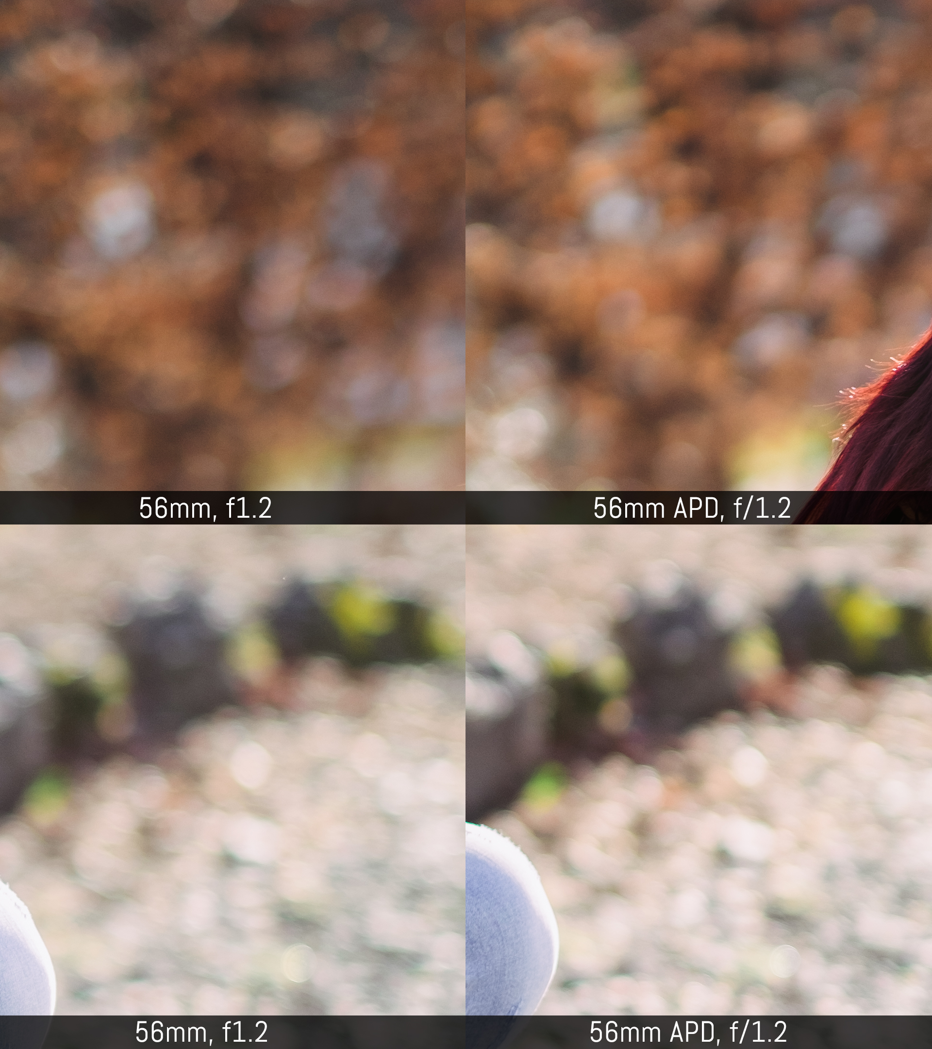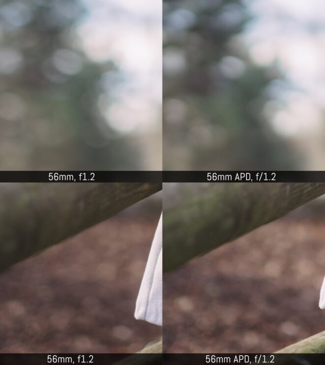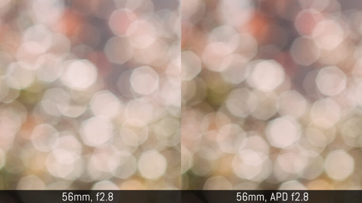 The differences are rather difficult to spot but there is definitely something to talk about. At first, the 56mm seems to render a shallower depth of field, and the out-of-focus area seems blurrier. In reality, it is just the bokeh that is different on the APD lens: it has more distinctive contrast and the out-of-focus circles have smoother edges. The circles appear smaller on the 56mm APD but they are also softer, while on the 56mm normal lens, the circles can have a more distinctive border. It almost looks as if the bokeh circles on the APD lenses are more “spherical” while on the normal lens they appear more like discs.